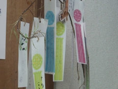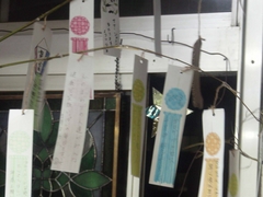 土曜に始めたので、まだ数は少ないのですが、中には「宝くじ当たりますように!」、「ガソリンを安くして!」、「2キロ減量したい!」など現実的なものから、「イルカに乗って泳ぎたい!」、「シンデレラになりたい!」といったような、可愛い願い事がたくさんさがっていますよ。まだ、工房に短冊を置いてますので追加してくださいね!