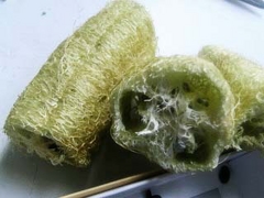 私が使ったところ、 「へちまのたわし」 は快適です! ナイロンと違って肌に優しいカンジ! もっとバリバリかと思ったら、首筋や顔でもOKなくらい、やさしいしっとりとした肌触りです。(いくつかのヘチマは固くて、生徒さんに「痛かったですぅ〜」と、不評でした。ゴメンナサイ! アハハ、大きいのは固いみたい。)