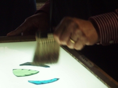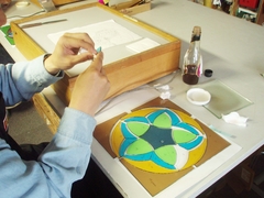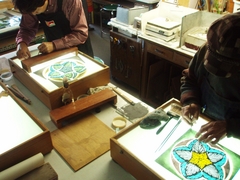 最初は、ステンドグラスの絵付け専用の穂先の長い筆に苦労されていたようですが、お二人とも線描きは、時間内に綺麗に描き終わりました。