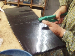 私たちは、大きなガラスを割る時は、作業台の端っこを使って、片手でガラスを押さえて、片手でガラスを下に落とすようにして、バッン! と割ります。(これ結構、快感! 一日に何枚もやると気分爽快!)
