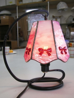 ピンクガラスの上に赤いガラスでリボンの形を切って乗せ、焼きました。ピンクのガラスの上に赤いガラスが、熱で完全に溶着しています。