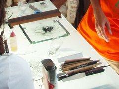 ●私達はいつもは、筆で線描きをしますが、Gペンという漫画家さんたちが使っているつけペンを使ってのデモ