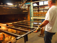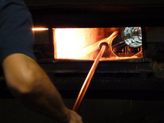 シリンダーの上部にはカッターでスコアを入れた割れ目がありますから、窯の中でシリンダーが熱せられトロンとしてきて、両側に開いていきます。窯の反対側に職人さんが待ち受けていて、両側に開いていくガラスを、棒? でうまく左右に開いたかを確認? 補佐? します。