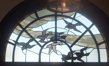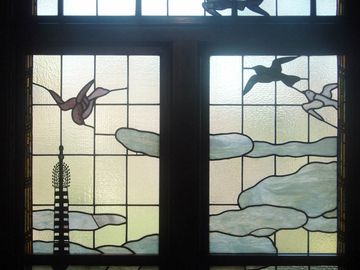 これまで、玄関ホールと階段室とレポートしました。あとは、応接間、サンルーム、食堂、書斎のステンドグラスをレポートする予定です。
