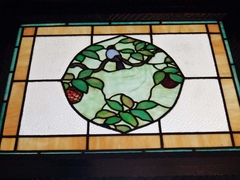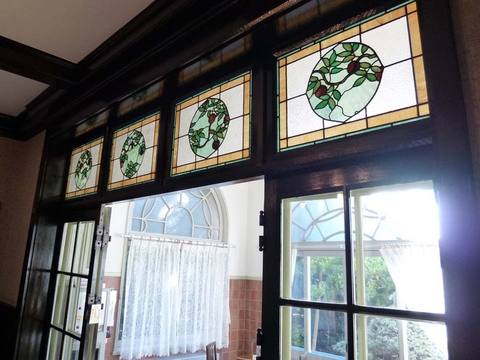 まず、サンルームと隣接している応接間の欄間です。ガラスは外壁に面していれば、酸性雨などで浸食されガラスがボロボロになっていきますが、このステンドグラスは外壁に面しているわけではないので、そんなに修復の必要がなかったのでしょうか・・・ オリジナルのまま残っていたのでしょうか・・・