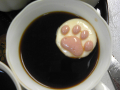 ゆ〜っくり溶けてコーヒーの上に広がっていきました。あま〜いクリームの上に、しばらく肉球が浮いていておもしろかったです。