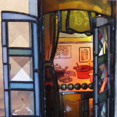 前回のブログ 「家型のランプ 制作は絨毯から」 は、絨毯の柄をサンドブラストで彫ったという内容でしたが、色々な技法を駆使して、楽しさと見どころが満載の家ができました。第32回 びどりを作品展 出品作です。