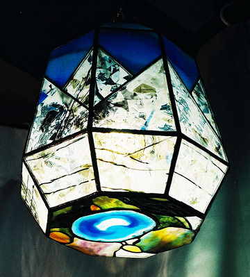 随分前になりますが、ネパールの4000m位の位置にあるエベレストの見えるホテルに泊まった時のヒマラヤの山々の強烈な印象をランプにして見ました。ちょうどウロボロス社の最新のガラスがぴったりイメージにあって良かったです。彩色水晶を二枚持っていて、対にヒマラヤの氷河湖のランプも作りました。