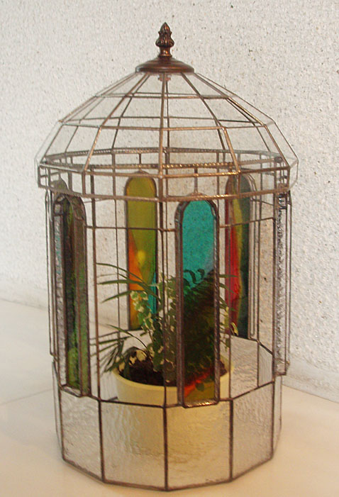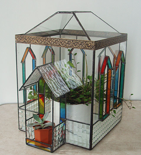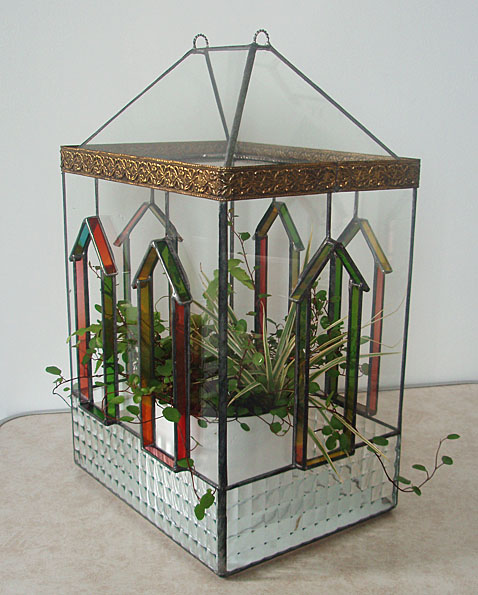 ステンドグラスのテラリウム(観葉植物を入れるガラス容器)は、いろいろな形を作ることができます。以前、住宅展示場でステンドグラスの展示会をする機会 があったので、いろいろな家のカタチに設計して作りました。