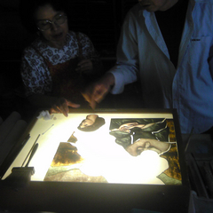 ロセッティのモリス婦人のデッサンが気に入って、それをステンドグラスにしてみようと思い制作しました。完成した絵はなかったのでそのデッサンを元に、色、模様(襟の部分をサンドブラストでレース模様)、背景を勝手につけました。