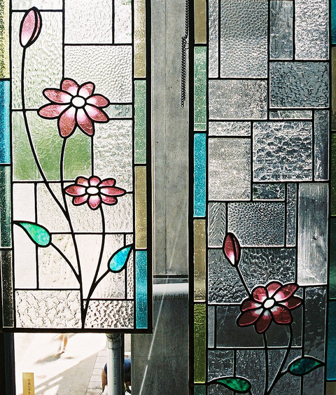 サンドブラストしたゴールド・ピンク(ランバーツ社)の花、ダイクロガラスと重ねてフュージングした花芯、そして、テクスチャー(肌合い)の違うガラスを10種類程、大小組み合わせて2枚のパネルを作りました。このパネルは嵌め殺しの窓に入れます。