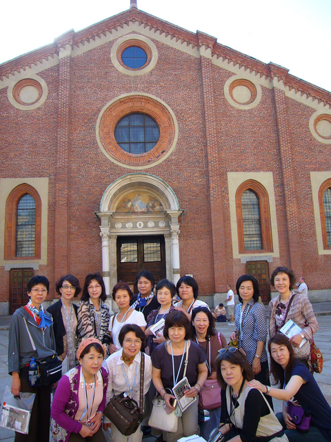 この写真は、初日にミラノのサンタ・マリア・デッラ・グラツィエ教会の修道院の 「最後の晩餐」 テンペラ画を見学し、教会内のステンドグラスも見学した後の集合写真です。