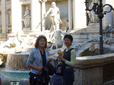 写真は、ローマのトレビの泉の前で、嶋本講師と高橋講師で、