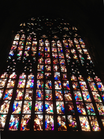 (大聖堂内には、ほとんど一枚の絵のようになっていて、ステンドグラスにする意味あるのかな… と思うくらい、もっと鉛線が少ないパネルもありました。)