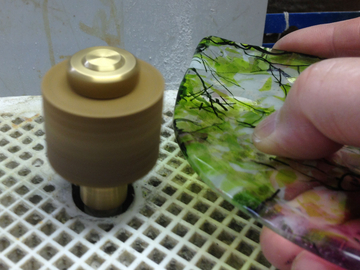葉っぱ型の小皿のオリジナルモールドにガラスをのせてスランピングしたのですが、バリが出てしまったので、削ってみました。