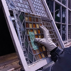 カチカチに固まっている白パテを、ステンドグラスを割らずに取り外すには、時間がかかります。