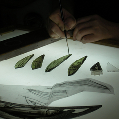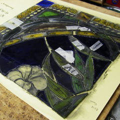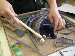 オリジナルと同じ太さの新しい鉛線で、ガラスを組み上げ、半田付けをします。