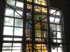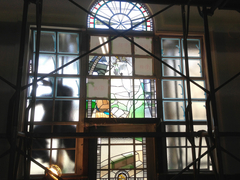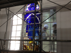 これで、450箇所のうち、三連の窓の中央の部分、222箇所の分のステンドグラスと当てガラスが入りました。