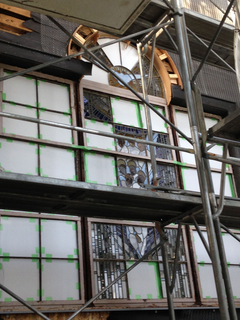 これを一度には直せないので、とりあえず一部 (三連の窓の左右の部分) は取り外すことになりました。一番、傷みが激しく、ガラスが飛び出したりしている部分だったからです。