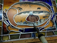 窯から出して、鉛線でガラスを組んで、半田付けをし、パテを詰めて、磨いて完成です!
