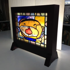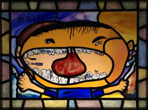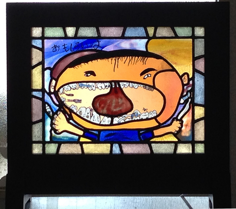 最初に拝見した時、絵が素晴らしい!と思いました。小学2年生ってこんなに素晴らしい絵を描くのですね。歯、1本1本に表情があるのですよ!大人には描けないかも。残しておきたいと思いますよ。それがガラスの中にそのまま描かれいる。良い思い出ですね。私も4歳の時、子供が描いた「お母さん」を本の栞にしています。ちょっとガラスでは残せないな。