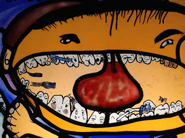 「おもしろいは」 と左上に描かれているこの絵は、息子さんが小学校2年の時に歯をテーマに描いた絵だそうです。