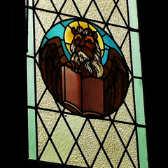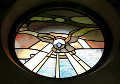入口を入って左側、皆で記念撮影した写真の左上に映っているステンドグラスです。