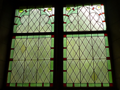 入口を入って、右の方を見ると、両側にこのようなシンプルなデザインのステンドグラスが、大小あわせて12ヵ所ありました。