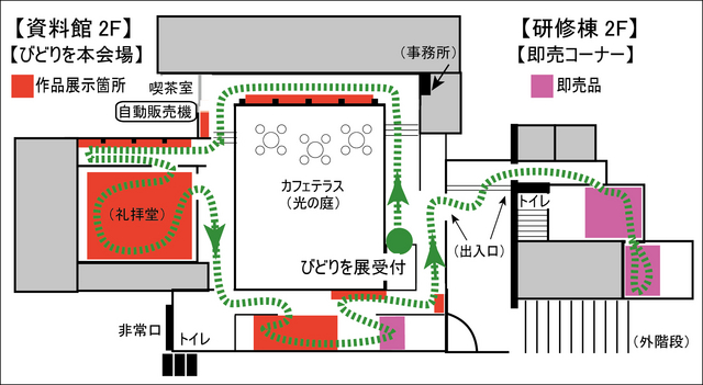 このように会場が広いので、当番の係員が誘導したり、出品目録の裏にも順路を印刷して、もれなく順路に沿って見ていただきたいと思っています。