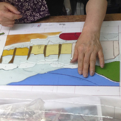 下の写真は、いま、「ステンドグラス グループ びどりを 第34回 作品展」 に展示中の作品の制作中の一部分の写真です。