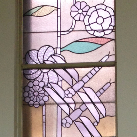 ステンドグラスの室内側にも保護ガラスが入っているので、写真には、四角いガラス扉の形が映りこんでしまいました。