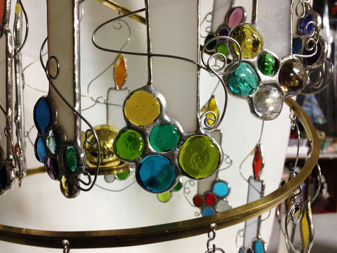 キャンドルの下のジュエルも、色々な色のガラスを重ねて窯で焼き、
