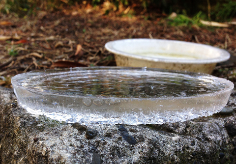 我が家の庭の小鳥の水飲み場に、綺麗な氷のロンデールができました。