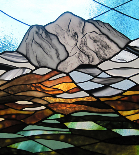 前面の山々は、グレー 〜 茶 〜 グリーン系の色ガラスを配置して