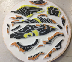 色別にすごい数のマスキングペイパーを作って、ガラスパウダーによるフュジングで文様を表しているのですね!さすが!!!