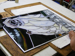 背景に使ったガラスは、ドイツに行った時にランバーツ社で買ってきたガラスを使いましたが、