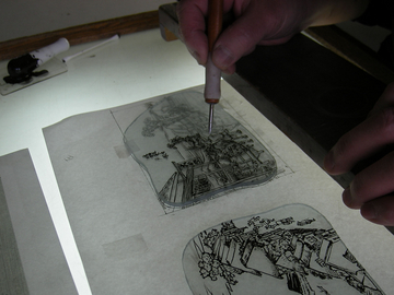 (グリザイユ)絵付け用の絵の具で線描きします。