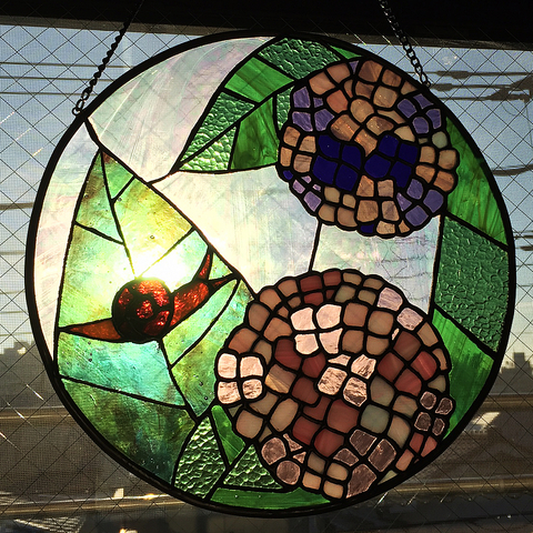 私も「あじさい」のモチーフで作品を作りたいと思っています。でも、こんなに大胆な構図ができな〜い。カタツムリが乗っている葉の、ガラスのカットラインが好きです。