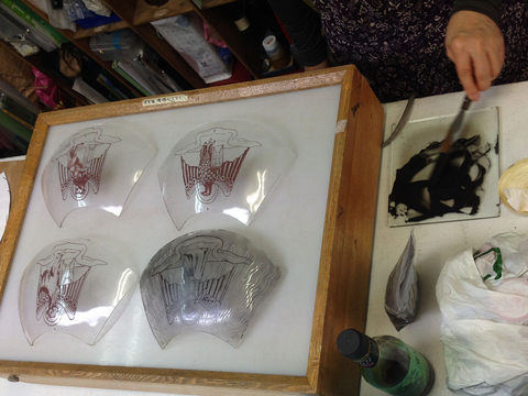 下の写真は絵付け作業中のガラス。