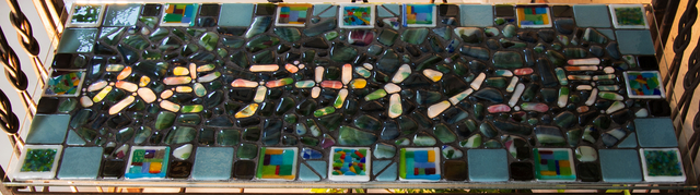 フリット(粒状ガラス) ・ パウダーガラス ・ フラクチャー(雲母上のガラス)などを使い、暇をみてはコツコツと窯に入れて焼き、モザイクに仕上げました。