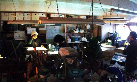 絵付け授業の日は、室内の照明を落として描くので、教室はこんなカンジです。
