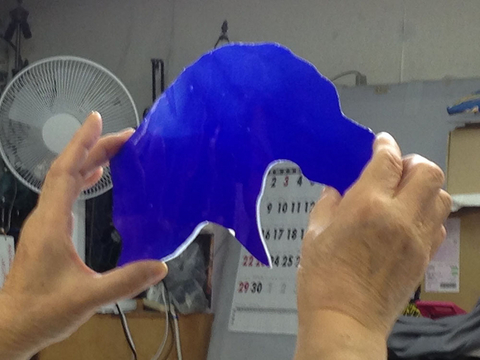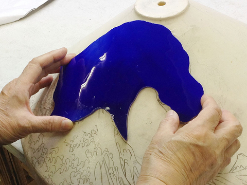 まず、ガラスをカット。ランバーツの青のオパックです。