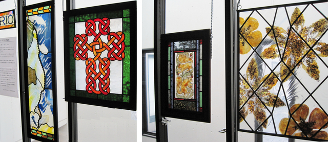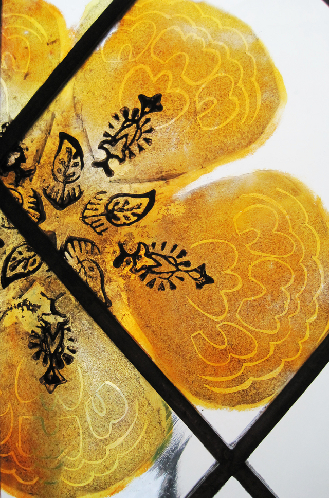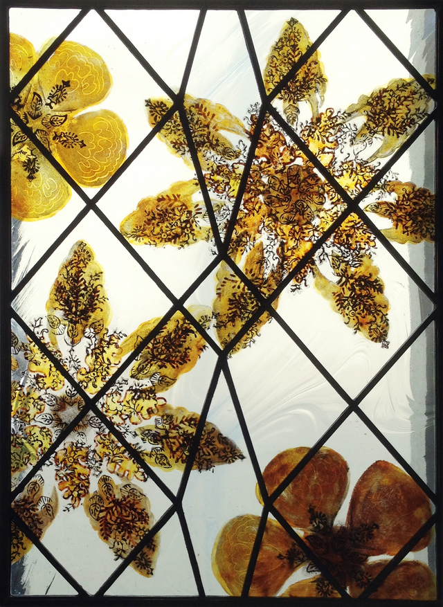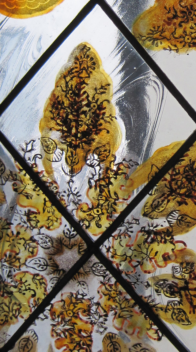 このパネルには、黄色と濃いめのアンバーと2種のシルバーステインを使い、