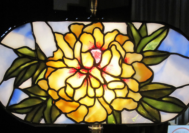 作者です。我が家の庭にも、今、えんじ色の牡丹が咲いています。好きな花の一つで過去に作った作品にも牡丹が多いです。また、ランプの型はお菓子の箱を使いました。大変だったのはスパイダーの付け方で先生にお願いしてしまいました。この形のためのベースも悩みました。手持ちのベースで使えるものはと考えた時、これがいいわよと言う仲間の一言で決まりました。この花にこの形、この形にこのベースと考えるのもステンドグラスの楽しみかたかなと思っています。