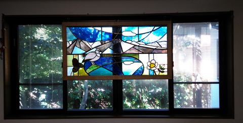 このステンドグラスは、幅1200mmなのに小さく見えますね〜