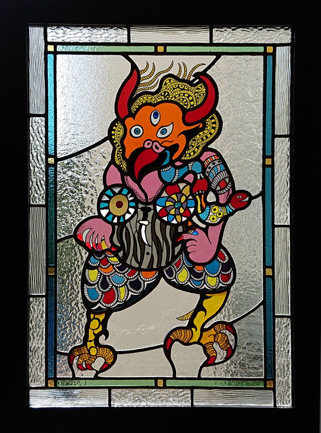 ステンドグラスの世界に入門して7年目、いつかは… と思っていたニキの世界に今回挑戦しました。急いで描かれたであろう原画は、着色がなされていない部分があったり、端部が切れてしまっていたりするため、パネルの制作にあたっては、原作者と共同制作をさせてもらう気持ちで、ある程度自分の解釈やアレンジも加えさせていただきました。