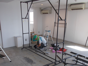 こう、こう、こうやって窓ごとにセットしてある鉄パイプを組んでください。
