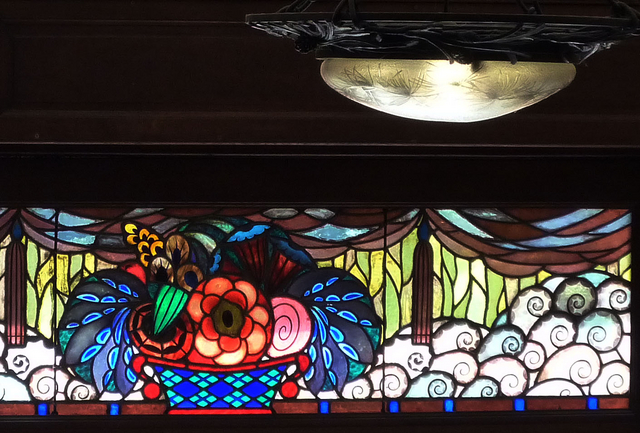 キャビネットの上部のステンドグラスを拡大すると・・・