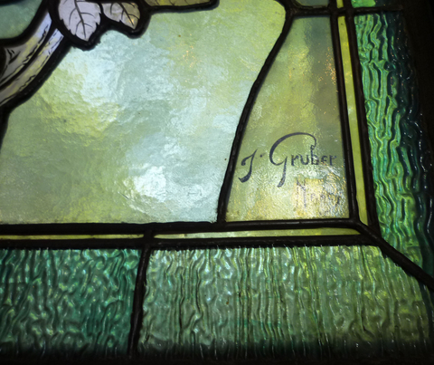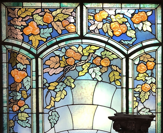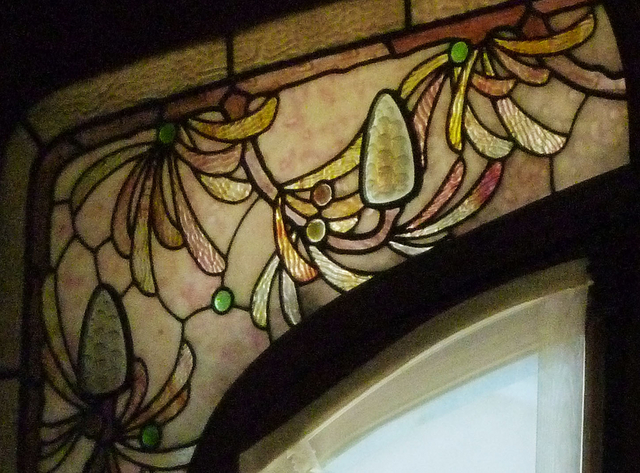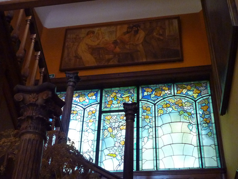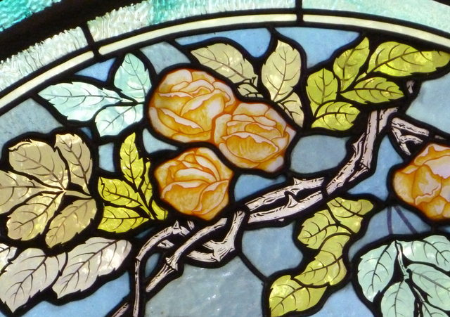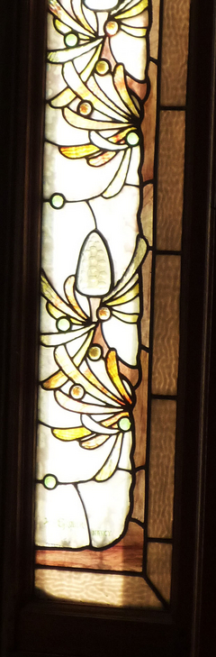上のステンドグラスは、前回のブログの最後の写真にチラッと映っていた、階段室のステンドグラスの一部です。