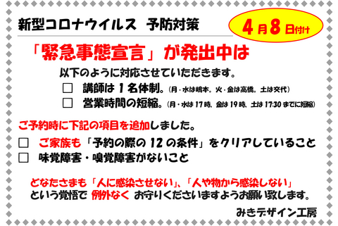 新型コロナウイルス 4月8日付け 予防対策 (緊急事態宣言 発出中)